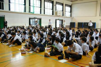 26日(木)4限総合的な学習の時間に,2年生は体育館に集合し,服育について学習しました。講師に村田堂の長屋さんを招き,着こなしやTPOなどいろいろな視点からご指導していただきました。クイズ形式の授業に生徒たち熱心に参加していました。授業の終盤には,「チャレンジ体験で,こんな店員さんに注文をとられたら・・」という寸劇では,先生が店員さんになり熱演していました。チャレンジ体験の事前学習で実施した服育学習ですが,日々の学校生活にも大いにためになったと思います。