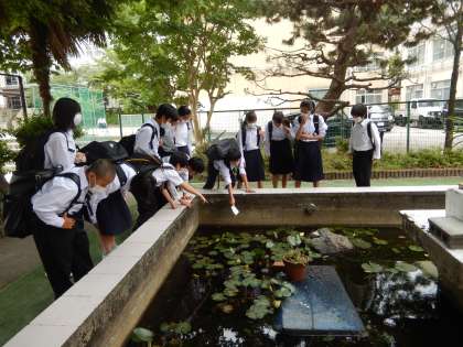 楽しそうな話し声。下校時、1年生がその声の主を探していました。蓮の葉の下に2匹のカエル。喉を膨らまして一生懸命会話するカエルも可愛かったですが、先生はそれを嬉しそうに覗き込むみんなの姿に癒されました。ほっこりする、素敵な一コマでした。ありがとう。