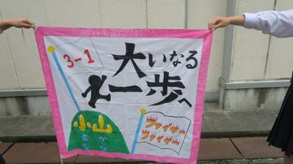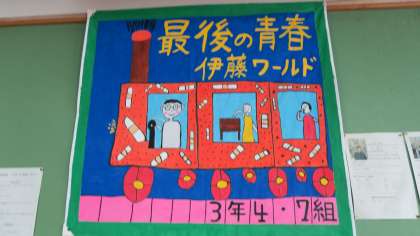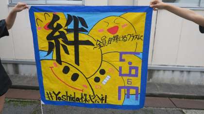 縁取りは、体育の部のカラーになっているので、鮮やかですね。6クラスあるので体育の部は黄色・桃色・オレンジ色・紫色・青色・緑色の6色です!!体育の部は4色の団に分かれます。しばらくは、教室掲示でお願いします。一足早く、修学旅行にも持って行って