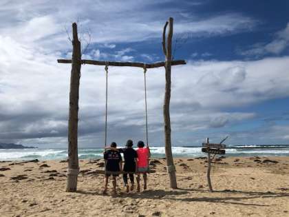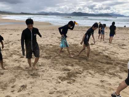supが中止でしたがみんな楽しんでいます。男女に分かれてビーチフラッグならぬビーチニワトリくんフラッグをしました。盛り上がりました。
