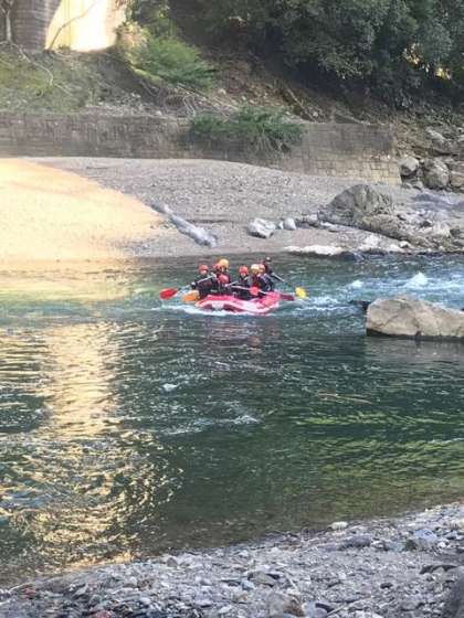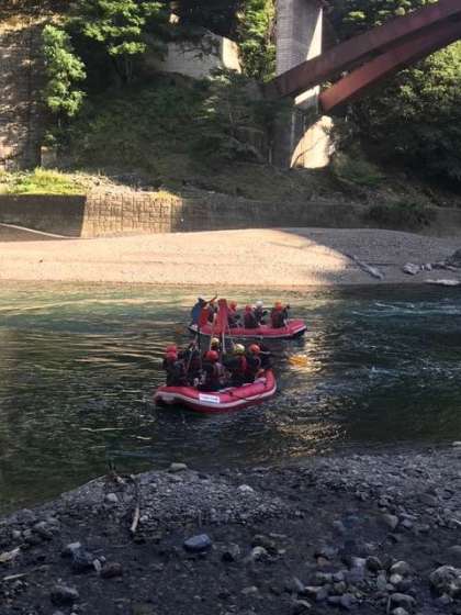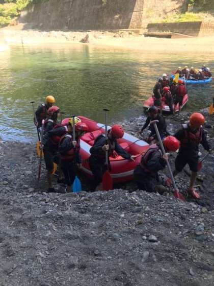 最初のスタート組がゴールしてきました。ラフティングは22グループあるので、到着するまでには少しタイムラグがあります。