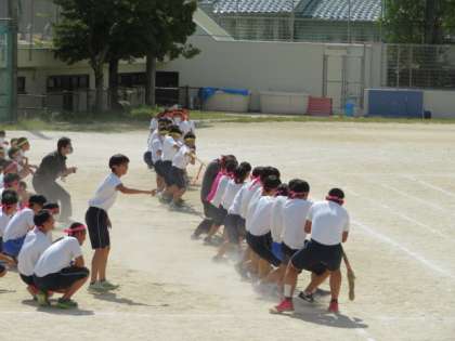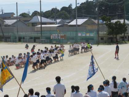 各色のA〜Cチームが総当たりの綱引き。”アツイ”戦いが繰り広げられました。この戦いは桃組が1位になりました。おめでとう!