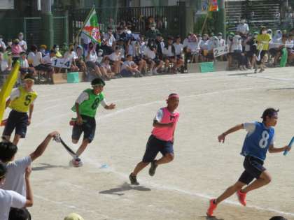 各色団の代表によるリレー。午前のプログラムの最後です。大変な盛り上がりとなりました。どの色も速かったですね。午後のプログラムは部活動対抗リレーからです。