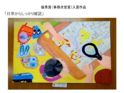 作品は「日常からしっかり確認」というテーマで,土砂災害等に備えて,ハザードマップで事前の避難の方法などを話し合っている様子が描かれています。