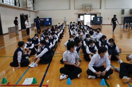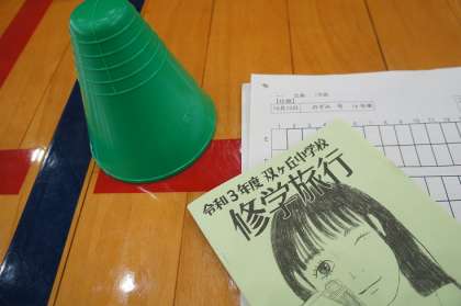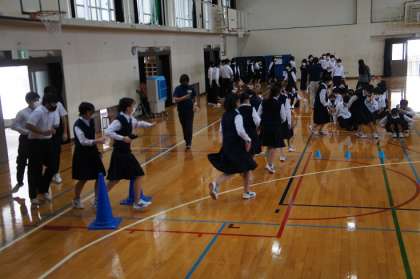 昨日の体育の部で頑張り、皆さん少しお疲れの今日、修学旅行初日の新幹線に乗るための整列と乗車をシミュレーションしました。体育館を車両に見立てて、スムースに集団行動が出来るよう、数回練習しました。実際には個人の荷物があるので、練習のまま出来るとは限りませんが、当日は落ち着いて迅速に行動して下さいね。