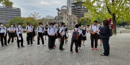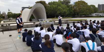 平和学習の最後に修学旅行委員による平和セレモニーを行いました。平和宣言、平和を祈る歌インテラパックスの静聴を行いました。