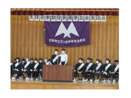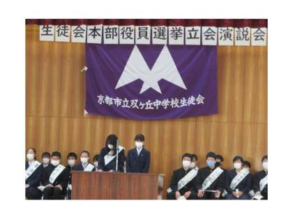 今年は,生徒会長,副会長,書記,会計の本部役員,評議会議長,生活,環境,文芸,体育の各専門委員長のポストに,19名の生徒が立候補し,双ヶ丘中学校をさらによりよく,活発な学校にするべく,各自の考えを訴えて,投票を呼びかけていました。