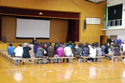 15日(火)まとめテスト(1日目)の午後から入学説明会を体育館で実施しました。来年度入学予定のお子たちがおられる保護者の方100名ほど参加していただきました。生徒たちの学校での様子を写したビデオをとても熱心に見ていただていました。本校からは,教務主任による教育課程等の説明,また生徒指導主任からの学校生活についての説明を聞いていただき,最後に来年度たくさんの生徒さんのご入学を期待していることを伝え終わりました。