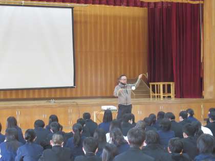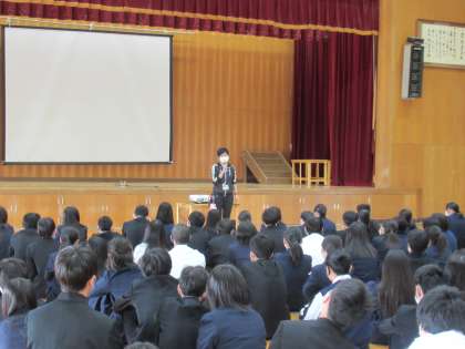 3年生初めての学年集会を行いました。学年の先生方から自己紹介に続いて、担当クラスの発表がされました。学年主任からは学年目標「ふかめよう」に込めた思いと、修学旅行に向けてのお話があり、みんな真剣に耳を傾けていました。いよいよ3年生だなという自覚を改めて持てた集会だったと思います。