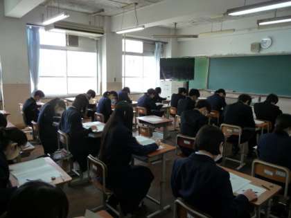 3年生は、1時間目から真剣に取り組む様子が見られました。今の社会に、これからの社会に求められる力はどのようなものなのか。どの教科の問題を見ても、昔のテストとは随分異なります。答えを出したらおしまい、ではなく、そのプロセスが大事。また、問題を読み解く力も重要です。文章だけではなく、表からもたくさんの情報をピックアップしなければなりません。一夜漬けで出来るものではなく、日々の積み重ねが重要ですね。これからも授業を大切にし、読み解き考える力をつけていきましょう!