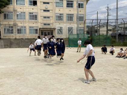 体育祭に向けて、1回目の学年体育を実施しました。暑い中でしたが、入退場や招集の練習はとてもスムーズで、さすが3年生ですね。各クラス対抗の大縄跳び練習は、一生懸命に跳び、回し、声を掛け合い、応援し、とてもよい雰囲気でした。すこしでも多く跳ぼうとする姿がとてもまぶしかったです。みなさんの体育祭の活躍が楽しみです。