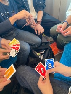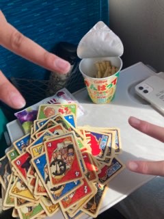 新幹線車内。カードゲームも解禁でわいわいしています。