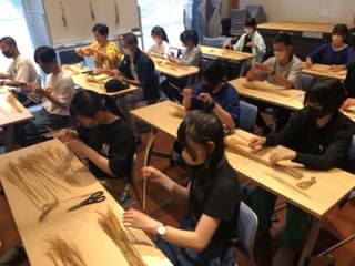 熊本の野焼きについて、勉強しました。阿蘇のススキでミニほうき作りをして、お土産に持って帰ります。