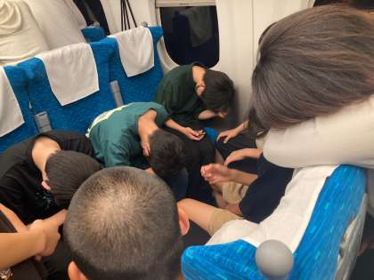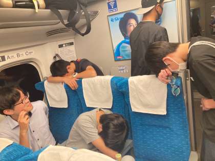 新幹線車内。お疲れで寝てるのかな?と、思いきや、人狼ゲーム中でした。