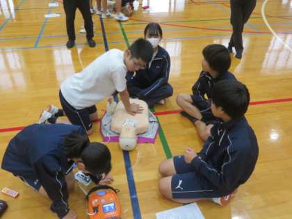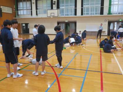 ダミー人形とトレーニング用AEDを用いて、実際に心肺蘇生法を行い、事前に習得した知識を活用しながら、教えあいや学びあいを行っています。頭で理解していても、実際に経験があるとないでは大きく違います。大変な事態があっては困りますが、もしもの時にパッと行動できるようにしたいですね。