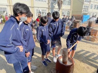 コロナ禍で開催が出来ていなかった御室餅つき大会が先週御室小学校で開催されました。本校の生徒も多数参加していたようです。つきたてのお餅に舌鼓を打ちながら久しぶりの開催を楽しんでいました。このような光景を見ると、コロナ前に少しずつ戻ったことと、年末だということを改めて感じます。昔は、近所でも餅つきの光景を見ましたが、今はこのような地域の行事でないと経験することも出来ませんね。中学生にとってはとても貴重な経験になったと思います。ごちそうさまでした。