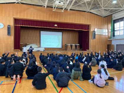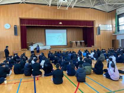 2時間目に2学期末の学年集会を行いました。各クラスの評議員が事前にクラスの課題を聞き取り、その上で過ごしやすく勉学に励める環境づくりを実践して来ました。その結果報告と更なる課題提起をしました。