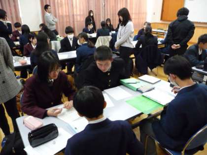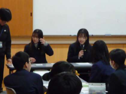 本日、四条中学校にて、右京支部生徒会交流会が行われ、本校の生徒会本部から4名が参加しました。代が変わって初めての交流会だったため、緊張している様子でしたが、発表や交流を頑張ってくれました。また、今回は司会も担当してくれました。内容については、「3年生を送る会」についての話し合いだったため、今日の交流会で得たことを是非3月の本番で活かして欲しいと思います。