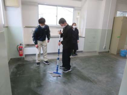 小グループに分かれて、実際に床掃除をやってみようということで、本校の2号館に移動しました。