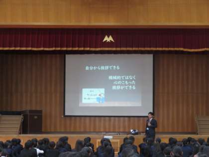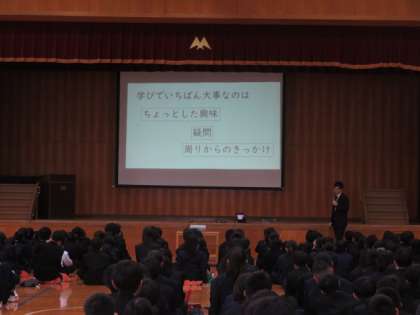 本日、5限に全校集会が行われました。生徒指導主事から学校生活の諸注意やあいさつの大切さ等の話をしました。また、研究主任からは学習の進め方や授業の受け方について話をしました。