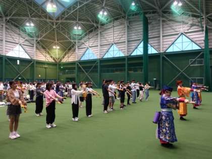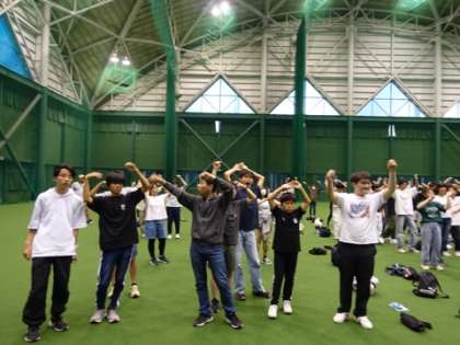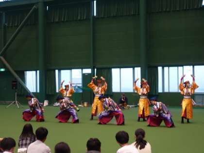 修学旅行最終日の始まりです。昨日の高知県民の方との交流会の様子をお伝えします。交流会では、高知県民の伝統舞踊、よさこいを観覧しました。よさこいチームTACYONという、よさこい踊りのチームの踊りを見せていただきました。その後、よさこい体験をさせてもらい、一部の生徒は鳴子を持って、本格的な体験もしました。その後、小グループに分かれて高知の方との座談会を行いました。事前に用意した京都のおすすめや、質問を行い、高知県民の方との触れ合いを楽しみました。その後、高知県民の方に、高知県に関するクイズを出してもらいました。二人三脚形式で、安芸ドームを広々と使わせてもらいました。写真は、よさこい踊りの様子です。