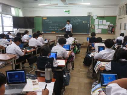 1年生は端末で地図等を確認しながら、世界の地理について学習し、2年生は方位や等高線について学習しています。真剣な眼差しで先生の話を聞く姿、丁寧にプリントに記入する姿があります。