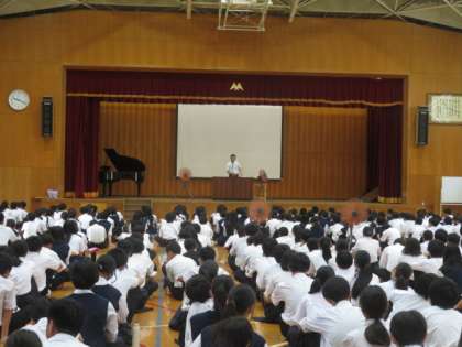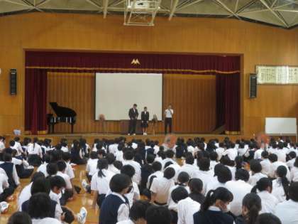 1学期終業式の様子です。暑い中、集中して校長先生の話を聞くみんなの姿がありました。また、新制服についても話がありました。