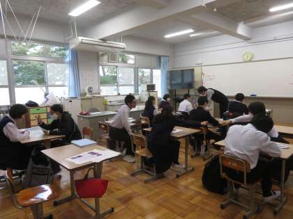 上は7組の社会の授業、下は1年生の英語の授業の様子です。明日から定期テストが始まります。今までの復習に取り組んでいます。
