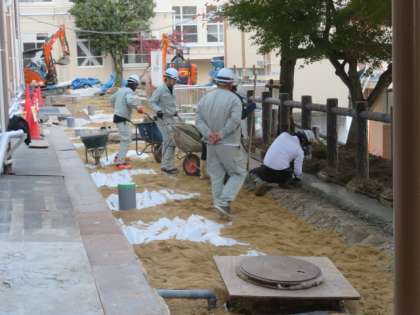 上の写真は5号館の東側を舗装してくださっている様子です。コンクリートやインターロッキングブロックになる予定です。