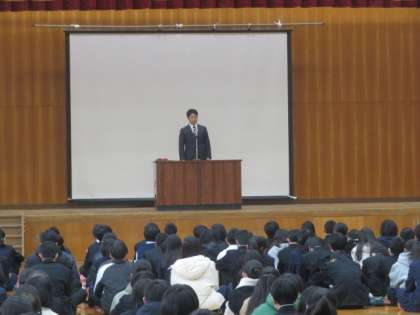 2学期の終業式を体育館にて行いました。学校長や生徒指導部長よりインターネット、SNSの利用に関して注意すべきこと等を話していただきました。また、図書委員長より、1月にある百人一首大会に向けての話がありました。その後、部活動や作文等の表彰があり拍手で仲間を称えました。