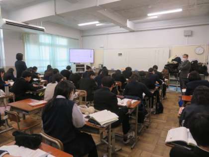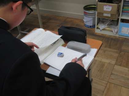 走れメロスの教材で、「根拠を持ってメロスの心情を読み取り、心情の上下をグラフにしよう。またその理由も書き込もう。」ということで、まずはみんな教科書をじっくりと読み込んでいます。その後、ノートにグラフを記入していました。なだらかな曲線にしている人もいれば、点をつなげて記入している人もいます。