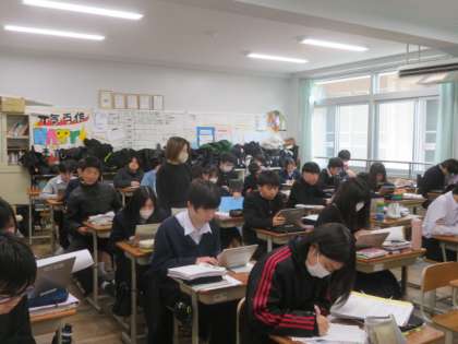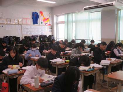 1・2年生、7組は明日から最後の定期テストです。テストに向けて、静かに真剣に復習に取り組んでいます。3年生は本日、公立前期選抜の2日目です。先輩も頑張っています!1・2年生、7組のみなさんも、ぜひ自分の実力が発揮できるように頑張ってくださいね。