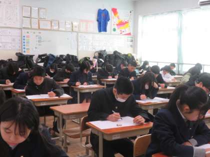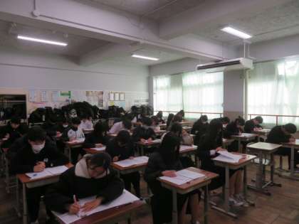 定期テストの最終日となりました。自分の実力を十分に発揮できましたか?休み時間も必死にノートや教科書を見ている姿がありました。頑張ろうという意欲が感じられた3日間でした。あと、1・2年生は17日間となります。残りの日々を大切に過ごしてほしいと思います。