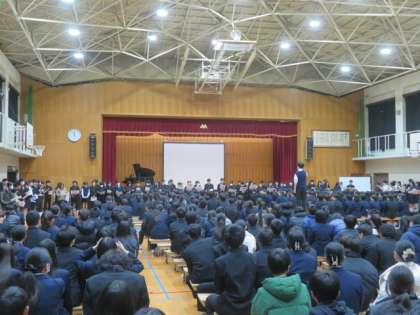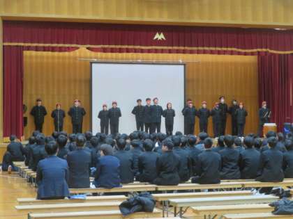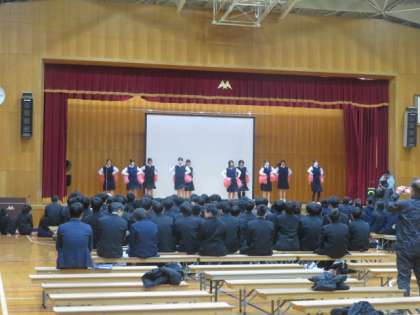 3年生を送る会が3、4限にありました。温かな拍手の中、3年生が体育館に入場し、まずはクラブメッセージがありました。次に1、2年生からの心からの贈り物がありました。