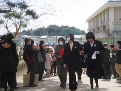 最後は、保護者の皆様や在校生のみんなで花道を作り、吹奏楽部の演奏と大きな拍手の中、卒業生は校門を出ていきました…。