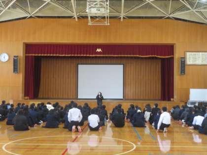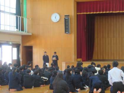 2年生の学年集会の様子です。クラスや学年の振り返りやレクレーションも行いました。いよいよ4月からは3年生。本日、公立中期選抜の合格発表でした。義務教育最後の1年を充実したものにしてほしいと思います。明日、ビシッと締めくくってほしいです。
