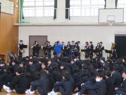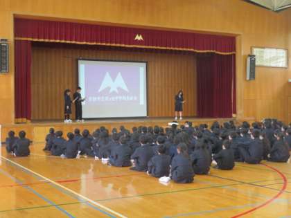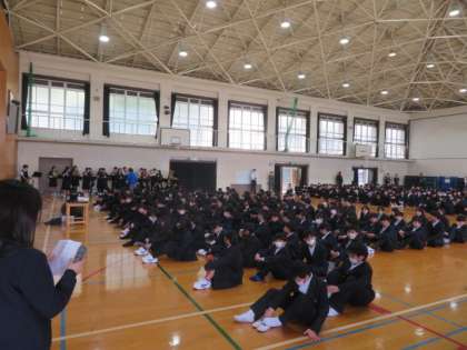 5限に新入生を迎える会を体育館にて行いました。3学年が初めて出会う時間です。生徒会本部より生徒会組織についての説明があり、教職員紹介も行いました。
