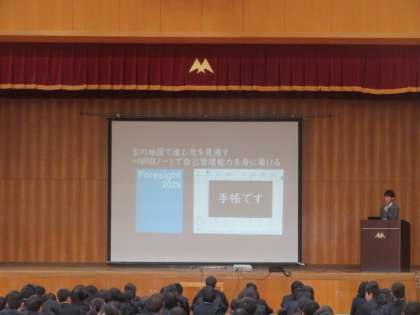 5限に全校集会を体育館にて行いました。校長先生からの話の後、研究主任から学習やNRBノート(スケジュール帳)の活用について、生徒指導主事より生活面についての話がありました。全体的にとてもいい姿勢で聴くことができていました。