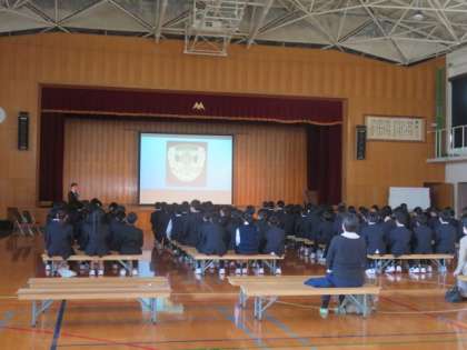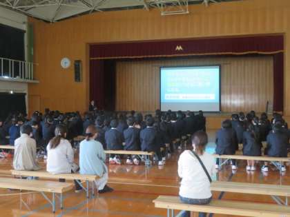 体育館にて、1年生は非行防止教室を行いました。保護者の方にもご参観いただきました。生徒指導課より講師の方に来ていただき、SNSでのトラブルや注意点を中心にお話をしていただきました。SNSはとても便利なものです。しかし、使い方を間違えると自分自身も、また友達も傷つけてしまう可能性があります。十分に情報モラルに気をつけていきましょう。