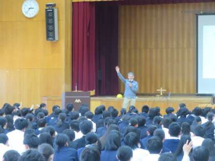 6限に全校が体育館に集まり、京都市花園地域包括支援センターの講師の方から認知症についてのお話を聞かせていただきました。認知症とは何か、また地域の中で地域の一員として認知症の方も「ともに」暮らし続けられるように、みなさんに学んでもらう機会として来ていただきました。