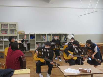7組は、音楽の授業でギターの練習に取り組んでいます。ポローンと音がなることがとてもうれしいみたいで、黙々と練習しています。