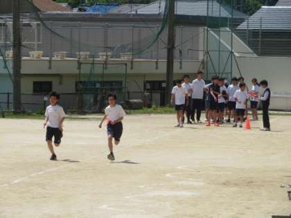 2年生の体育では、50メートル走に取り組んでいます。最後まであきらめずに一生懸命走り、タイムを聞いて、全身で喜んでいる姿がとてもステキです。