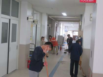 7組の自立活動の様子です。本館1階の廊下を、マットをめくって、ホウキでキレイに掃いてくれています。床の溝も意識しながら、丁寧に作業を進めてくれています。その作業によって、みんなが快適に学校生活を過ごすことができます。ありがとう。