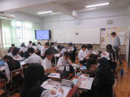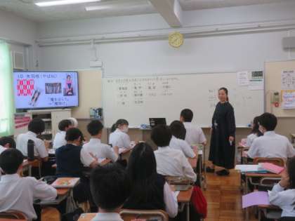 家庭科では、様々な文様について、学習を深めていました。それぞれの文様に反応し、いろんな意見や感想が飛び交っていました。