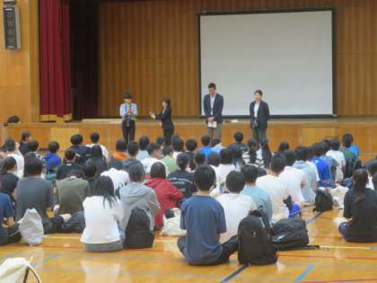今日から修学旅行スタートです。体育館で結団式が行われました。旅行業者の方や写真屋さんにご挨拶をし、実行委員長が決意の言葉を語ってくれました。