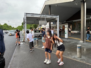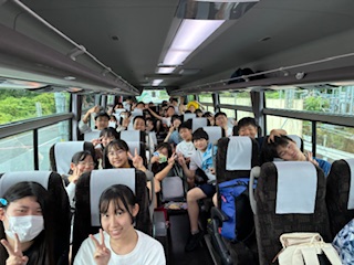 昼食を取る飯田までやってきました。あいにくの雨でバスの中で昼食を取ることになりそうです。しかし生徒たちは修学旅行を楽しんでいます。
