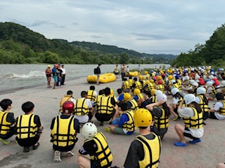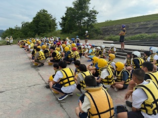 雨の影響で増水しているため、コースを変更してラフティングを行います!生徒の皆さんも楽しみです。