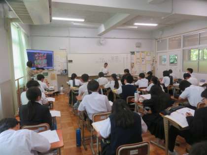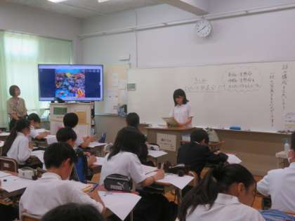 1年生の国語の授業の様子です。自分の好きな物を写真に撮り、話の構成を工夫しながら、スピーチをしています。堂々と語りかけている姿がとてもかっこよかったです。
