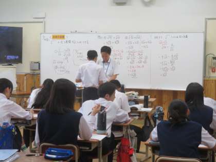 数学では、問題を解けた人は先生に確認してもらっています。出されてすぐに回答できた人もいました。コツコツ頑張っています。