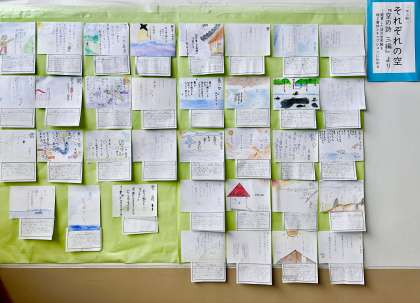 ポストカードは、一人ひとりが『空の詩 三編』から想像した世界観を、絵と字体で表現したものです。キャプションとして鑑賞文も添えました。それぞれが描いた空が、踊り場の壁面を明るく彩っています。思考のツールを学ぶ授業で考えた『ベン図』は、たくさんの力作のなかから、アイディア溢れる作品を貼り出しました。